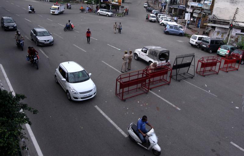 Vehicles move past a police checkpoint in Jammu, on Aug 8, 2019, as some restrictions on movement remained in place in the city following the Indian government's controversial move to strip Jammu and Kashmir of its autonomy.