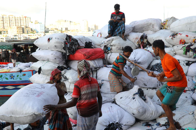 Workers loading a ferry with garment waste in Dhaka, Bangladesh, on July 28, 2019. Only one in eight garment factories meet requirements of an international accord on worker safety, said the head of the industry's body.