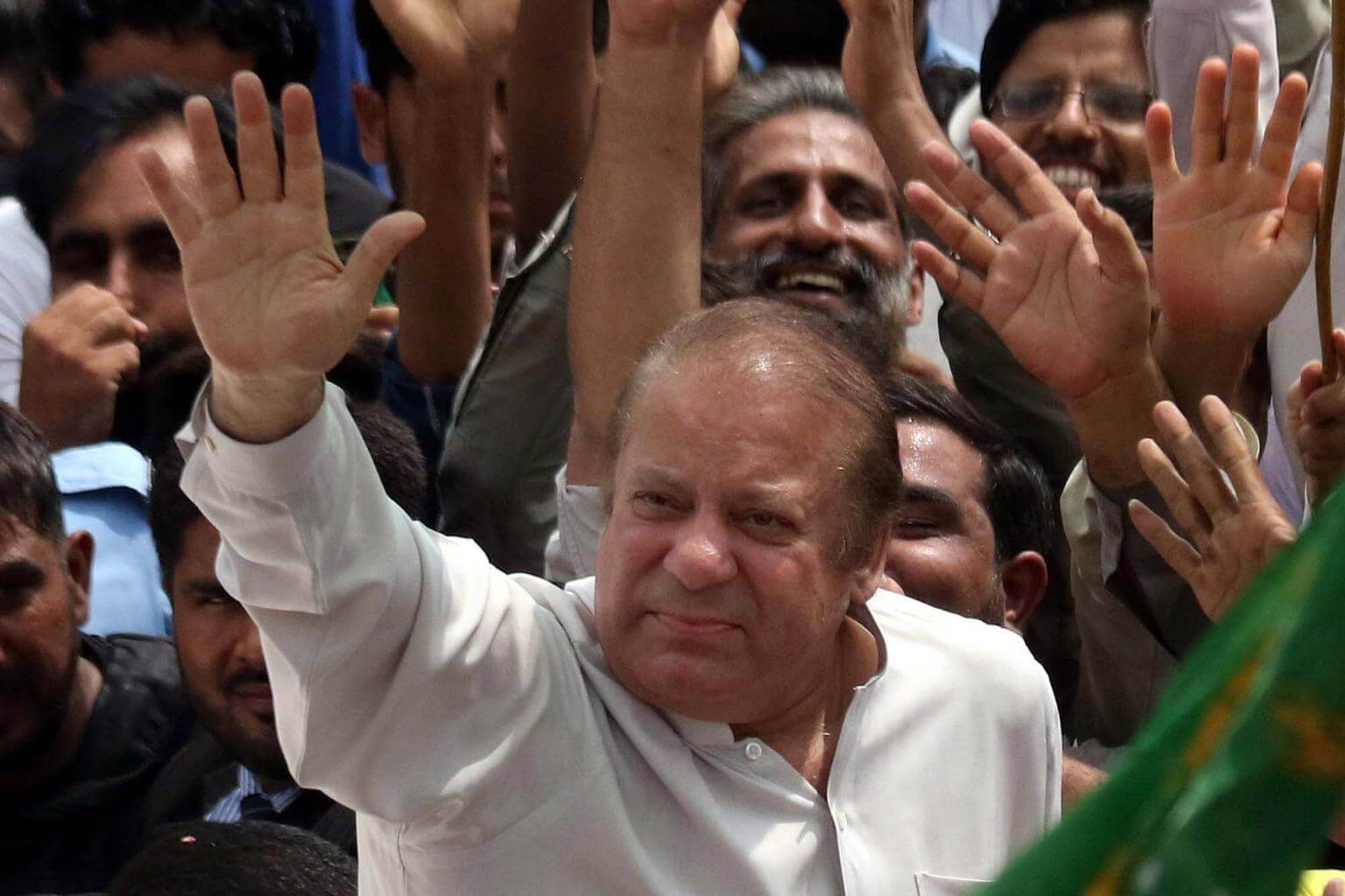 Then Pakistan PM Nawaz Sharif waving to supporters during a trip from Murree to Islamabad on May 5, 2017.