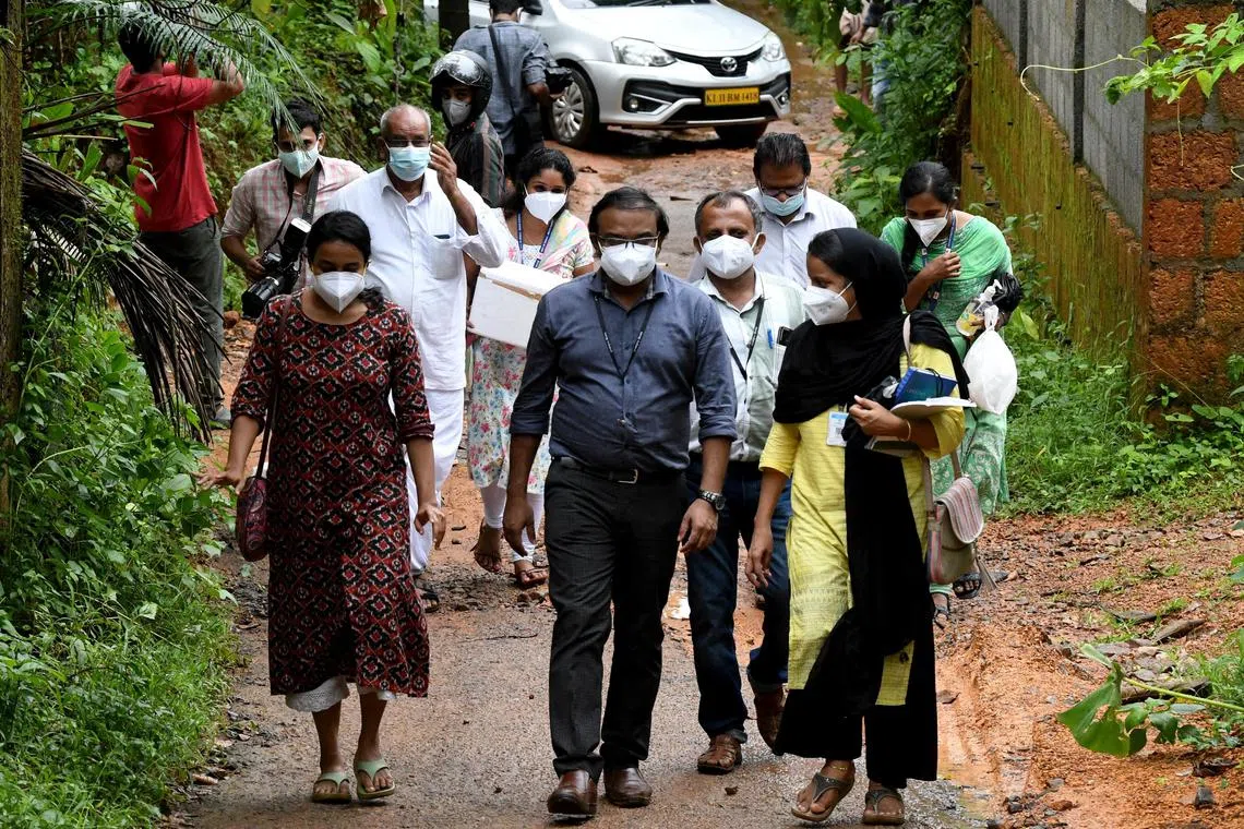 Members of a medical team from Kozhikode Medical College carrying areca nut and guava fruit samples for Nipah virus testing, in Maruthonkara village, in Kerala’s Kozhikode district.