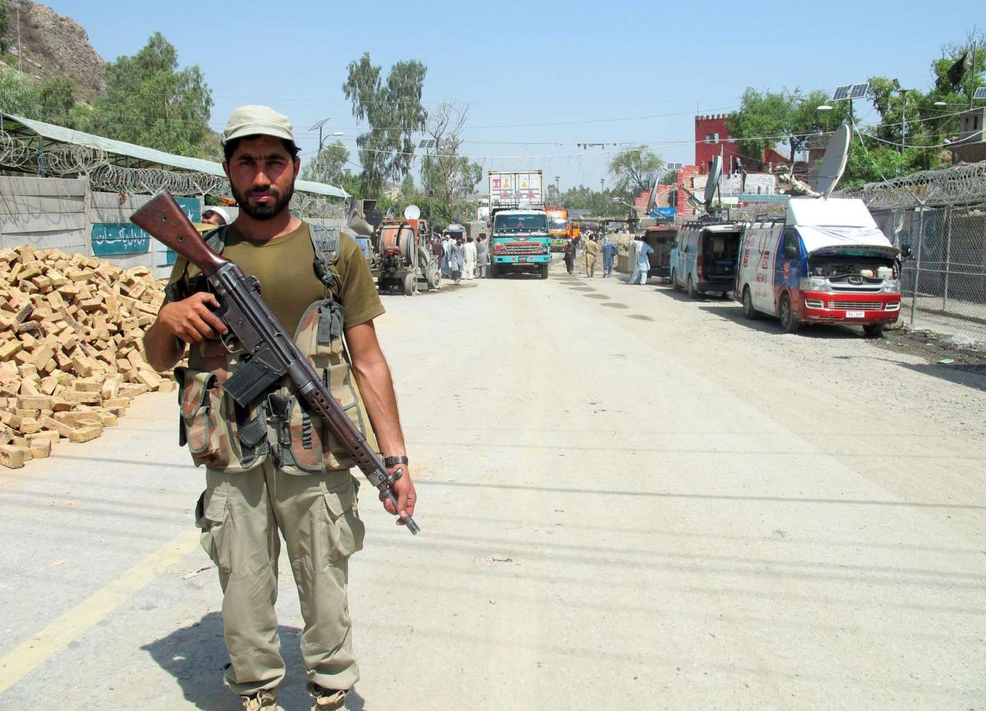 Pakistani security officials stand guard after border with Afghanistan was opened, at the Pak-Afghan border crossing at Toorkham, Pakistan, on June 18, 2016.