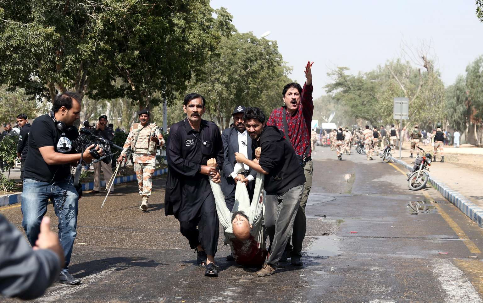 People carry a man who was injured during an anti-government protest in Karachi, Pakistan, Feb 02 2016.