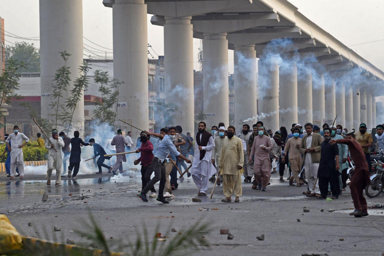 Police use tear gas to disperse supporters of a Pakistan Islamist party during a protest in Lahore on April 12, 2021.