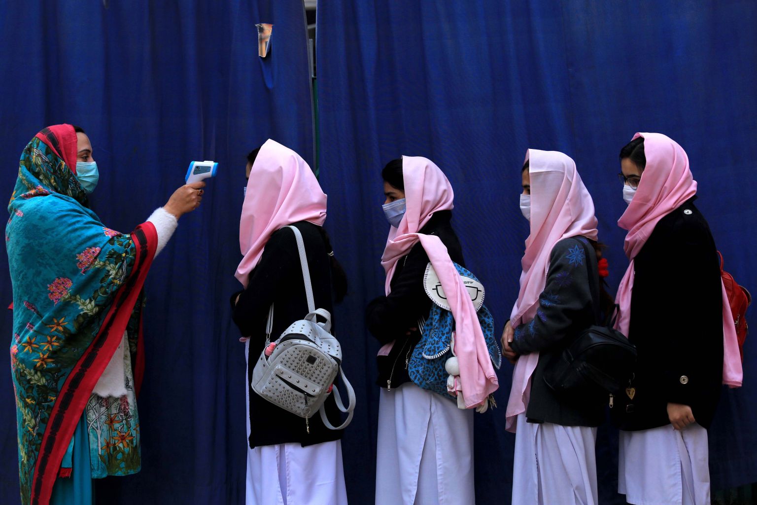 School staff check the temperatures of students in Peshawar, Pakistan, on Jan 18, 2021.