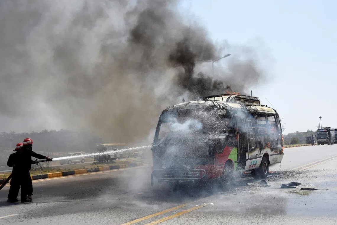 Firefighters try to douse a bus that caught fire during clashes with the supporters of Pakistan’s former Prime Minister Imran Khan.