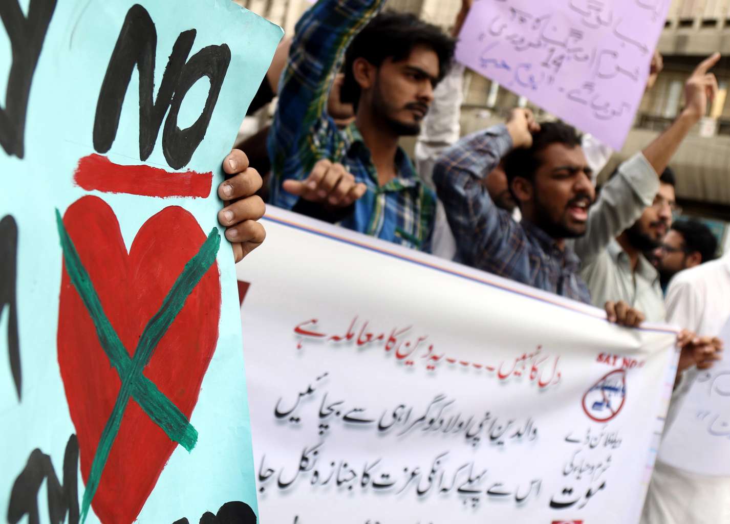 People shout slogans during a protest against Valentine's Day in Karachi, Pakistan, on Feb 12, 2017.