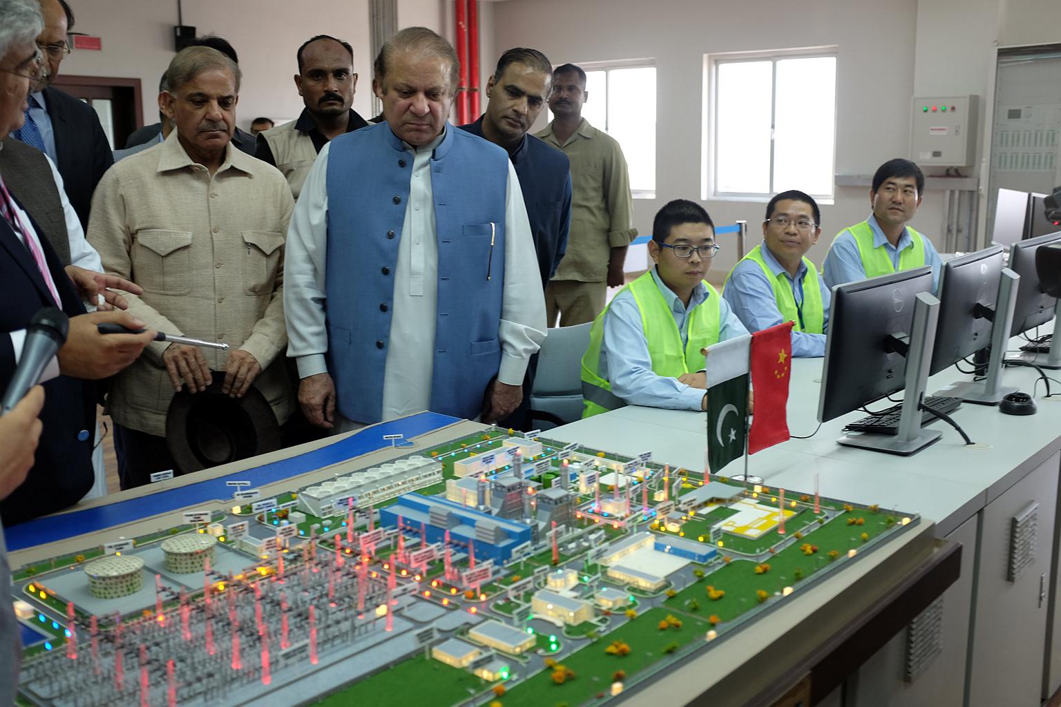 Pakistani Prime Minister Nawaz Sharif listens as experts explain a process of the Haveli Bahadur Shah LNG power plant during the inauguration in Jhang, Pakistan, on July 7, 2017.