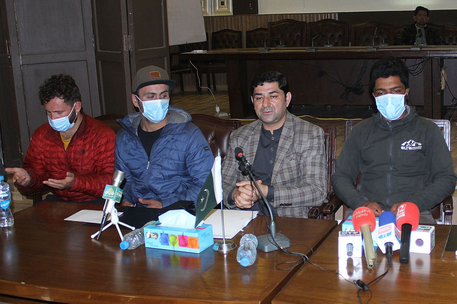 Raja Nasir Ali Khan (second right), provincial minister for tourism in the Gilgit-Baltistan region, speaks during a press conference along with Sajid Ali Sadpara (right), the son of missing Pakistan's climber Muhammad Ali Sadpara and relatives (left) of missing Chilean climber Juan Pablo Mohr, in Skardu on Feb 18, 2021.