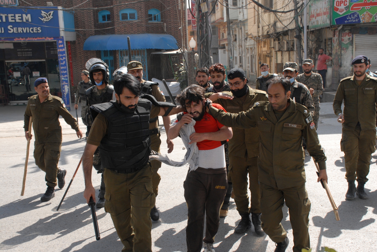 Pakistani security officials arrest supporters of Islamic political party Tehreek-e-Labbaik Pakistan in Rawalpindi, Pakistan, on April 14, 2021.