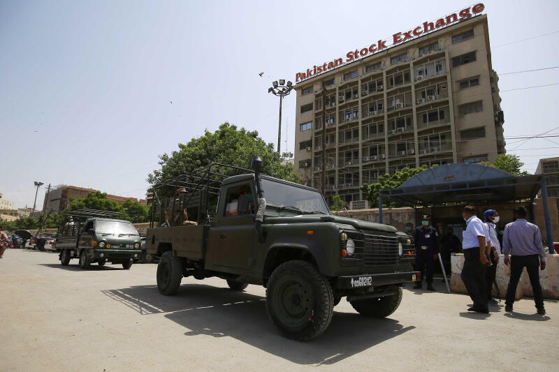 Security officials secure the Pakistan Stock Exchange a day after terrorists attacked the building, in Karachi, on June 30, 2020.