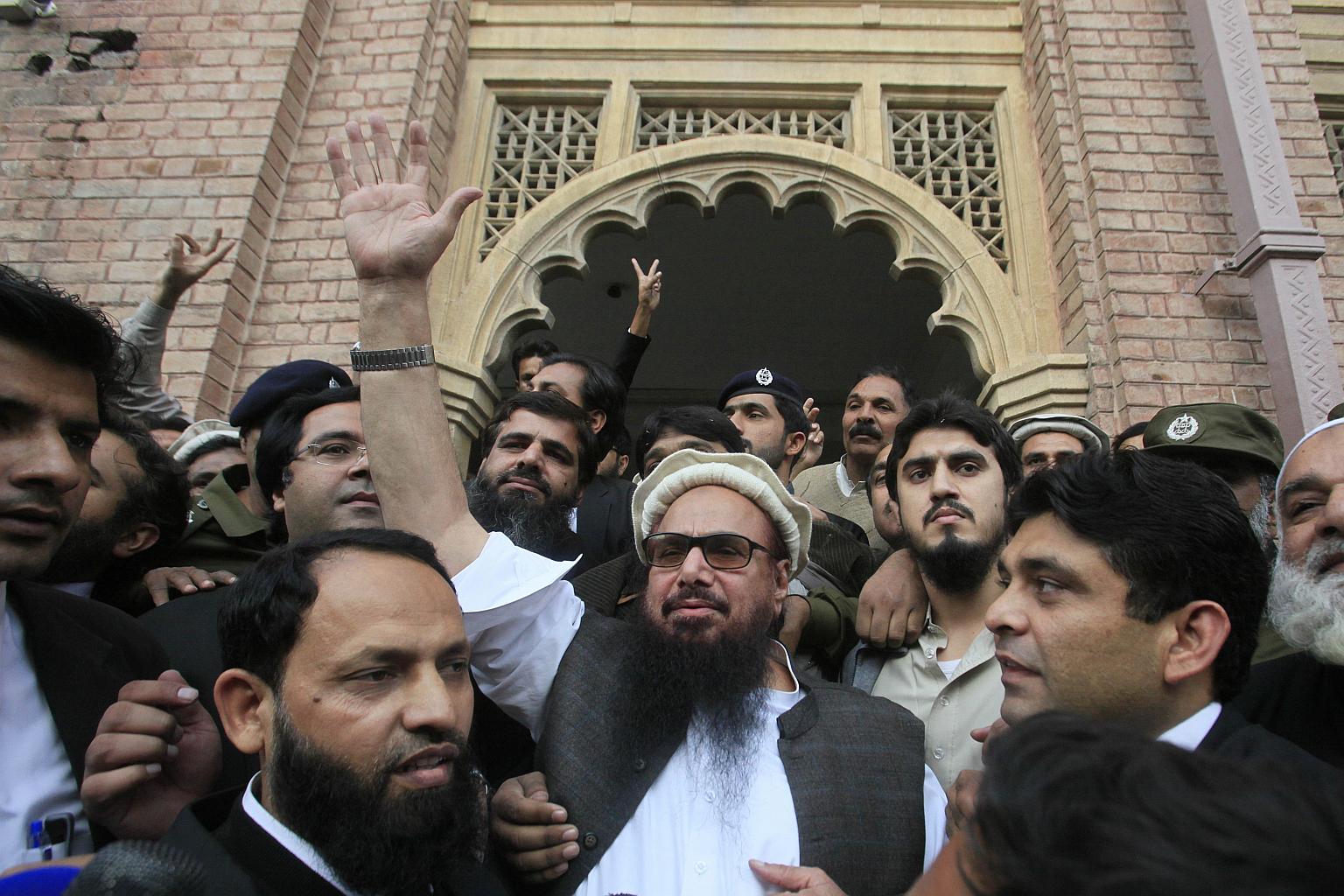 Hafiz Saeed (centre), the head of banned Islamic charity Jamat ud Dawa, waves to supporters after he was released by a court in Lahore, Pakistan on Nov 22, 2017.