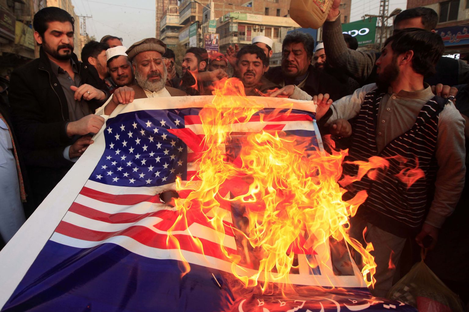 Pakistani traders shout slogans and burn a US flag with a picture of Donald Trump in Peshawar, Jan 5, 2018.