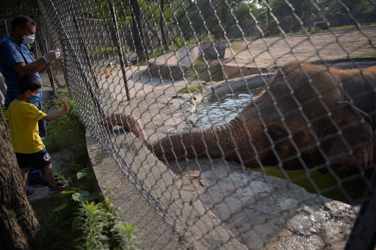 People gesture as Kaavan takes a bath behind a fence at the Marghazar Zoo in Islamabad on July 18, 2020.