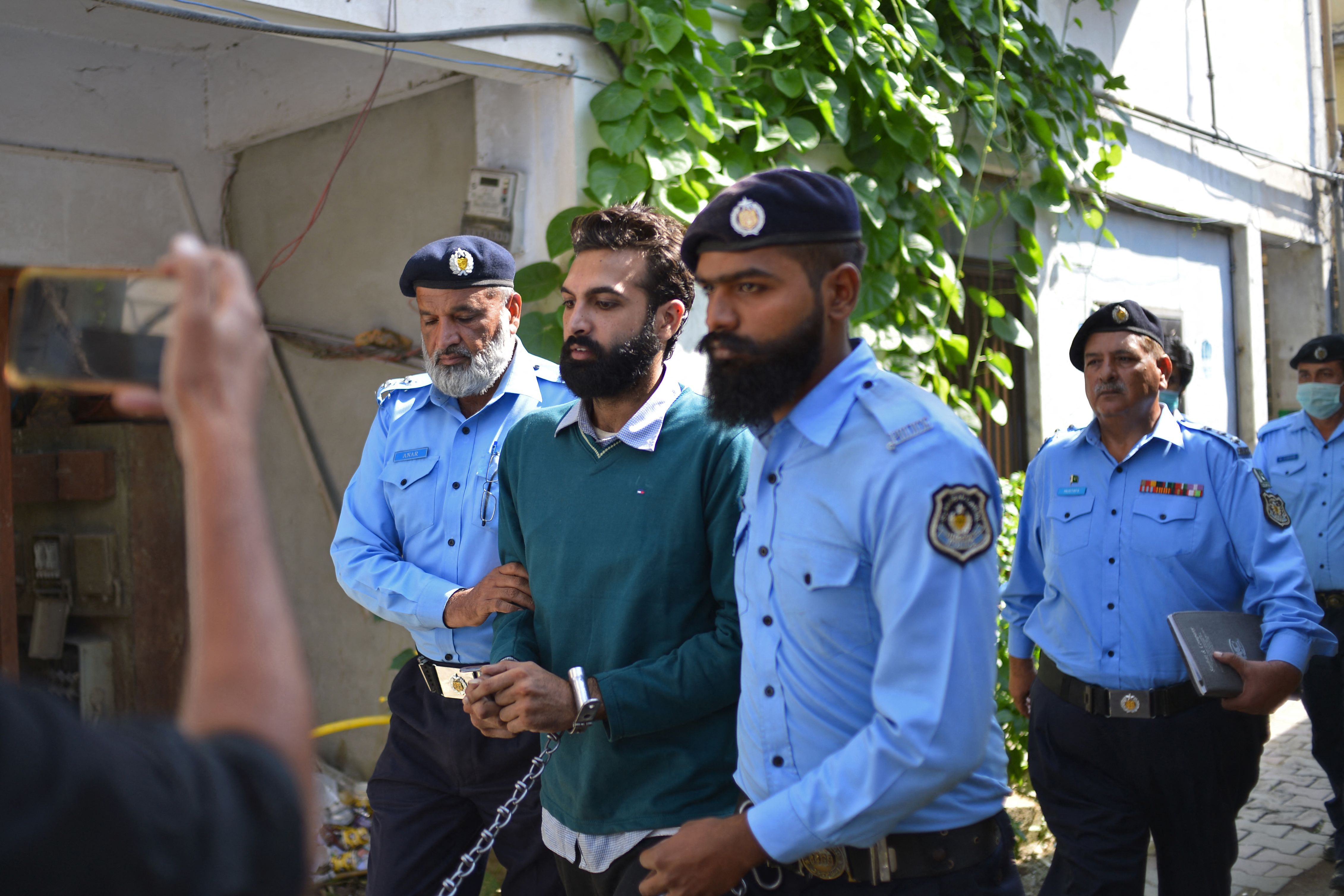 Policemen escort Zahir Jaffer (second from left) after his court hearing in Islamabad, on Oct 20, 2021.