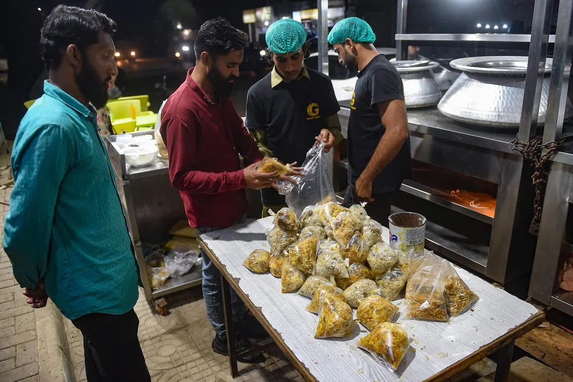 At Ghazi Foods, 28-year-old Ali Nawaz paddles out dozens of portions of briyani into plastic pouches, which are delivered to poor neighbourhoods on motorbikes.