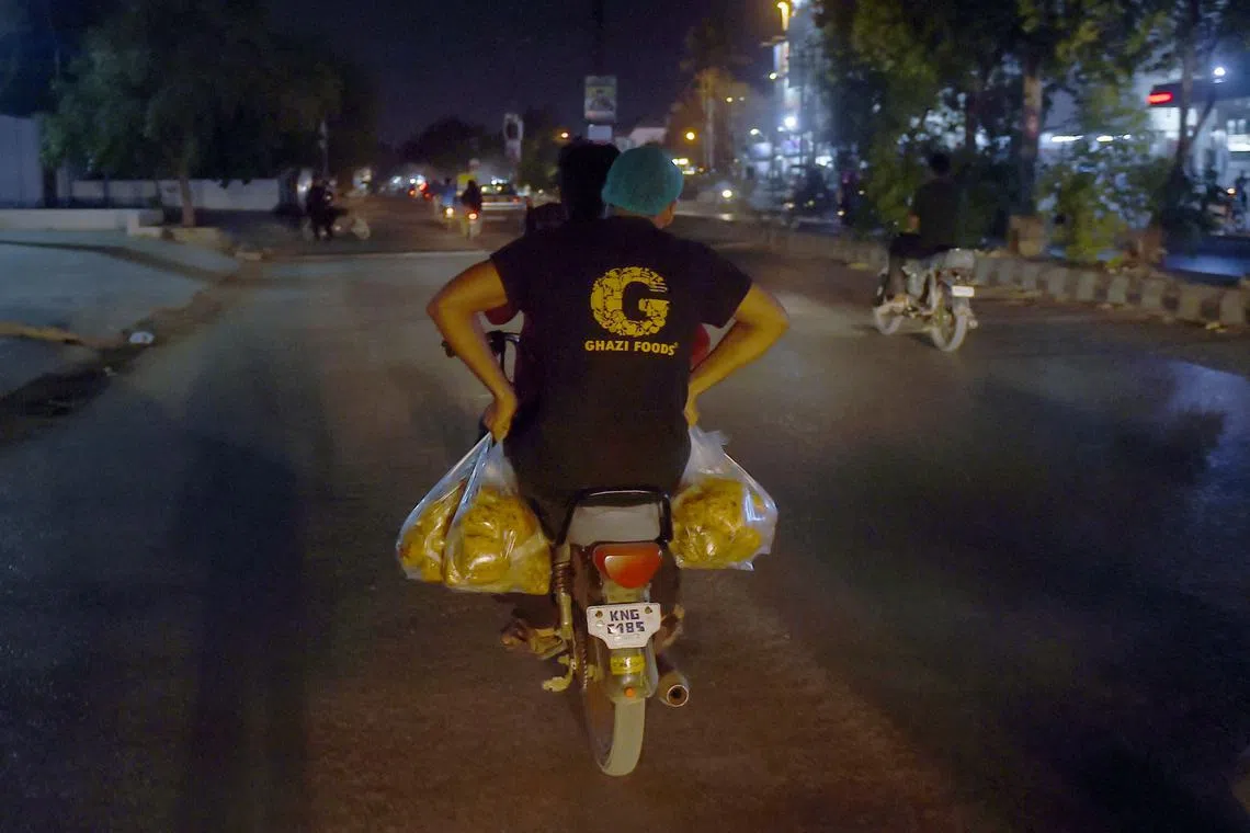 A minute after one of those bikes stops, the briyani is gone, seized by kids and young adults.