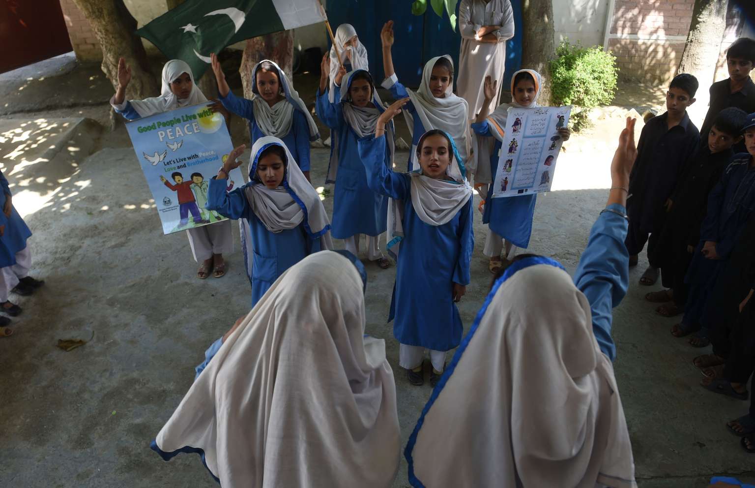 Hindko speaking schoolchildren sing the national anthem at their school in Mansehra.