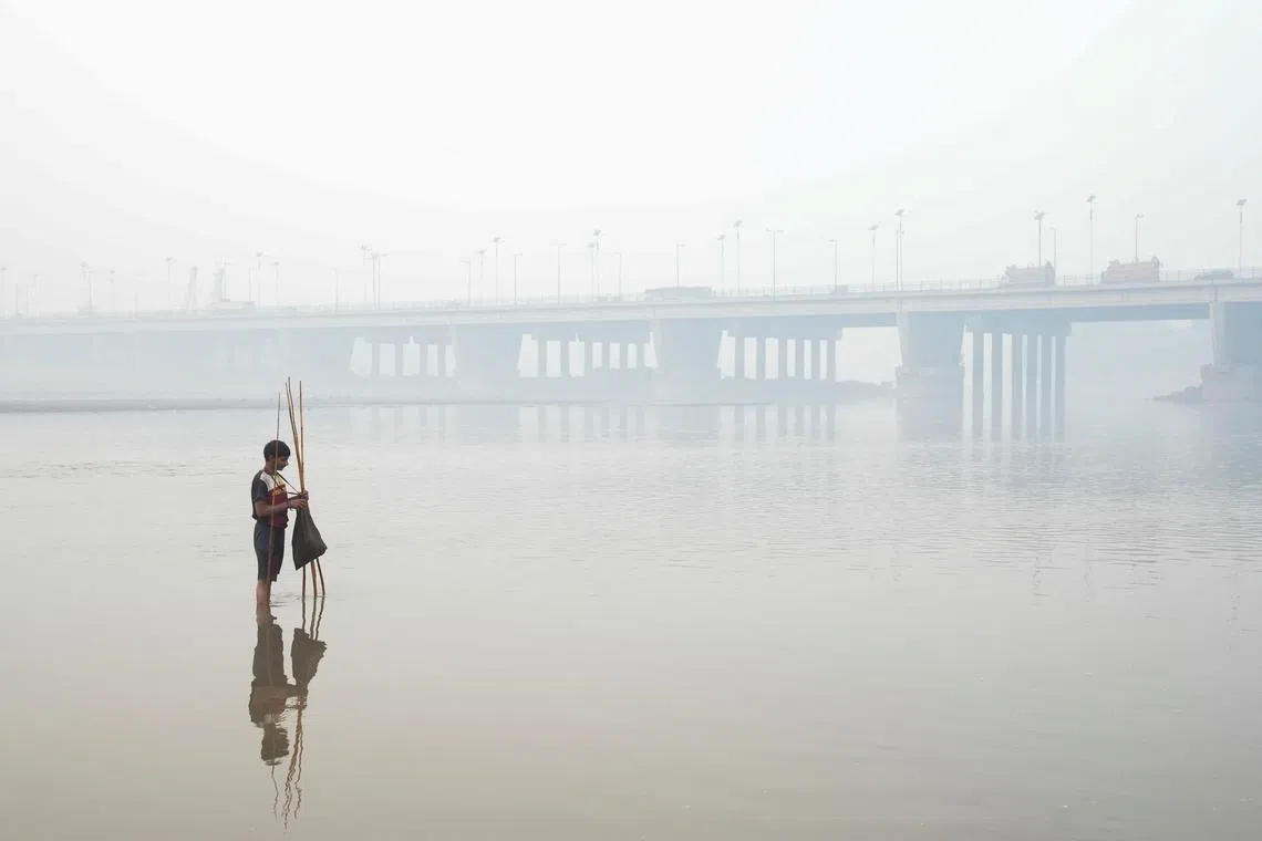 A man setting up a fishing trap, with the bridge over the River Ravi in the background, amid smog in Lahore, Pakistan, on Nov 5.