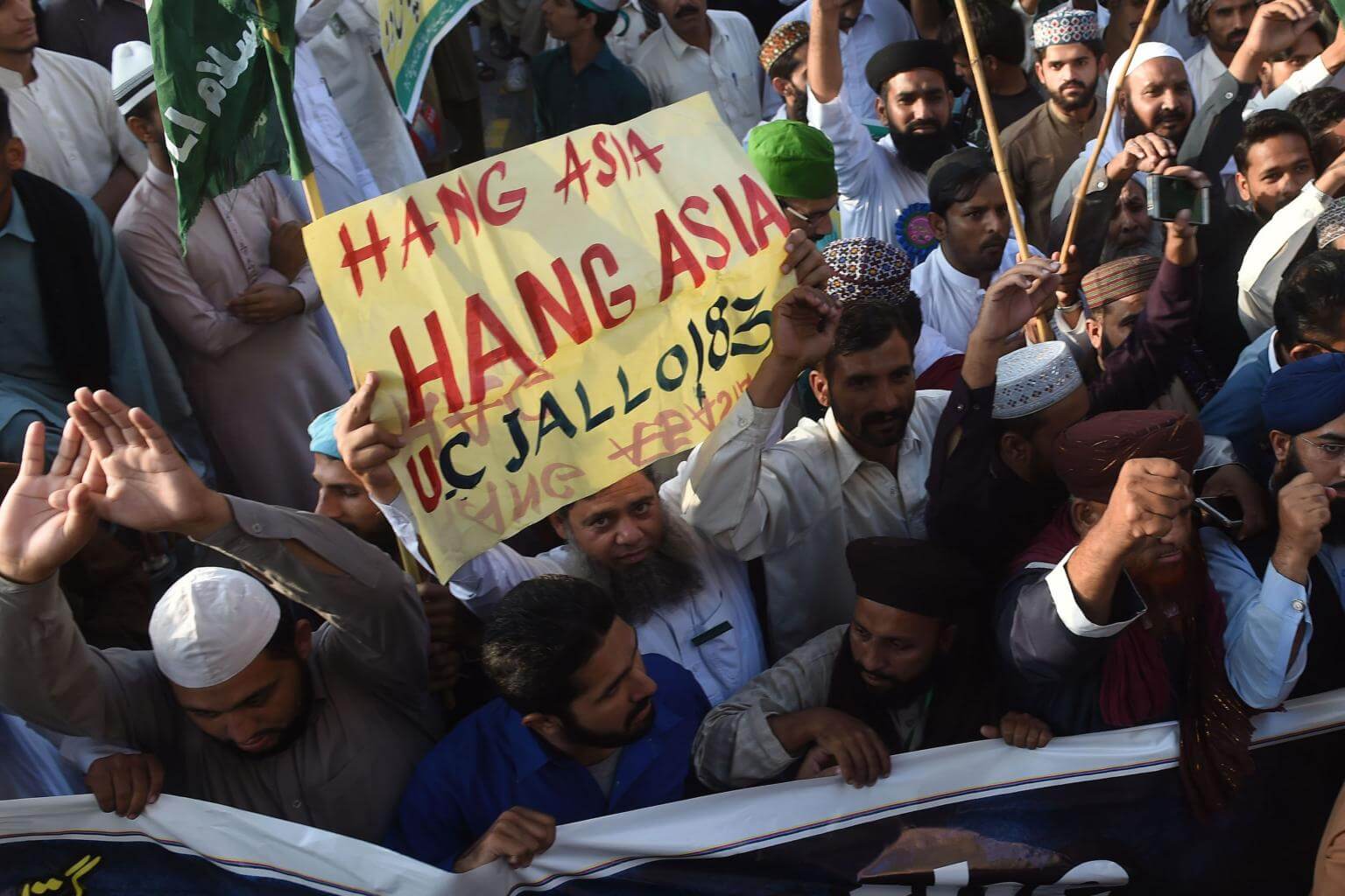 People march during a protest in Lahore on Oct 19, 2018, demanding for the hanging of Christian woman Asia Bibi.
