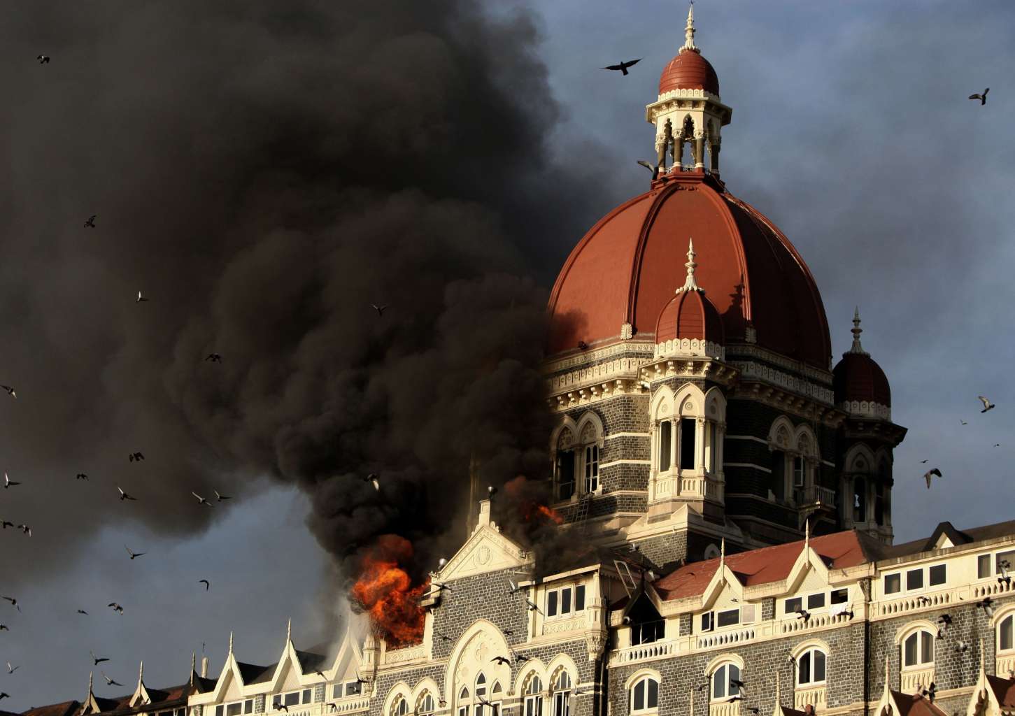 Flames and smoke gush out of The Taj Mahal Hotel, one of the sites of the 2008 Mumbai attacks by alleged militant gunmen.