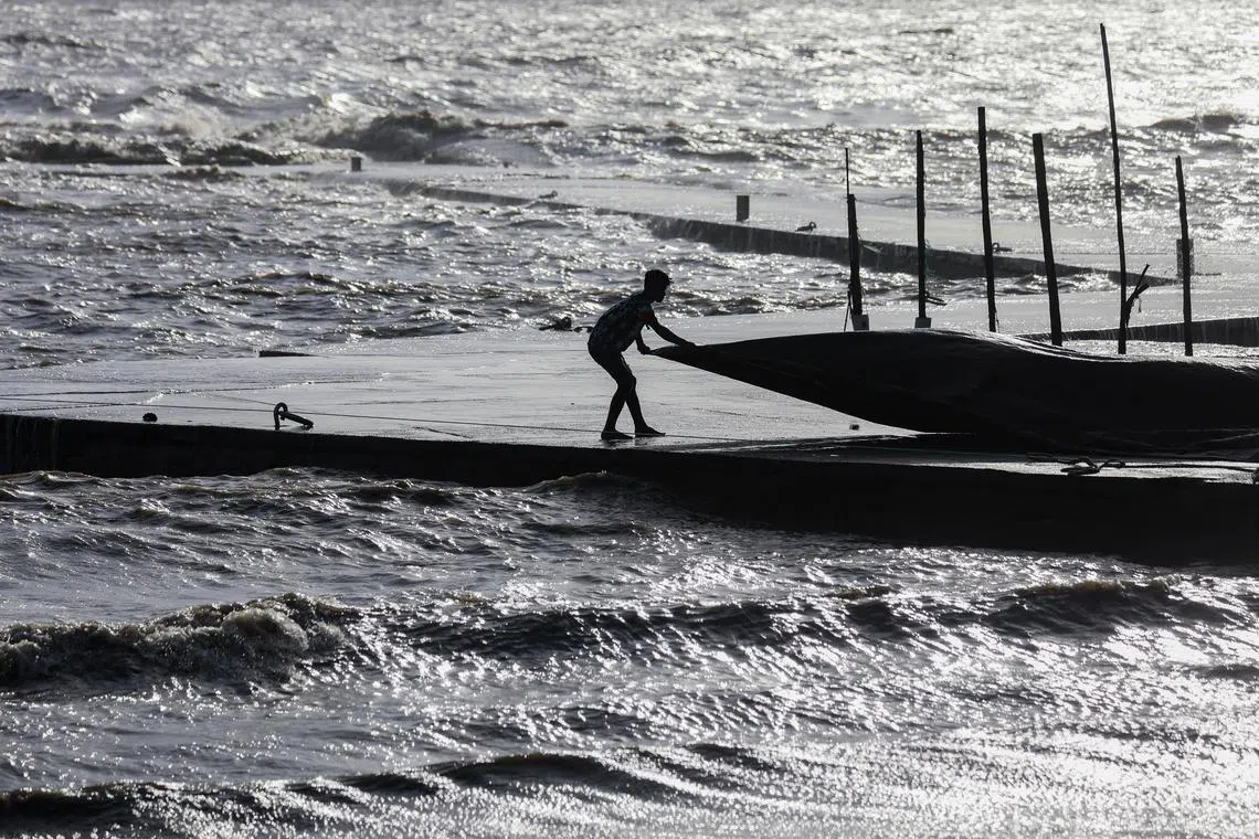 A fisherman from the Koli community cleaning a tarpaulin sheet at the Gorai beach by the Arabian Sea, in Mumbai, India, on June 9, 2023.