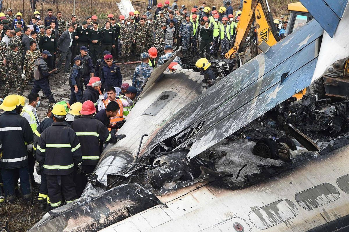 Nepali rescue workers gather around the debris of an airplane that crashed near the international airport in Kathmandu on March 12, 2018.