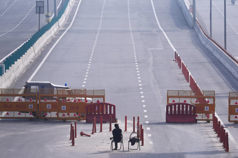 A man sits at barricade during a lockdown by the authorities to limit the spreading of Covid-19, in New Delhi on March 23, 2020. The lockdown in the capital of more than 18 million people will last for the rest of the month.