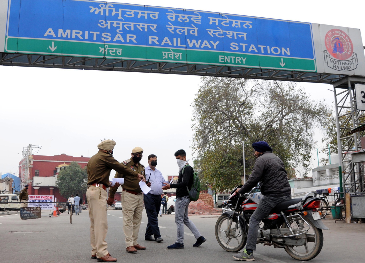Punjab police officers distribute coronavirus awareness pamphlets outside a railway station in Amritsar, India, on March 21, 2020.