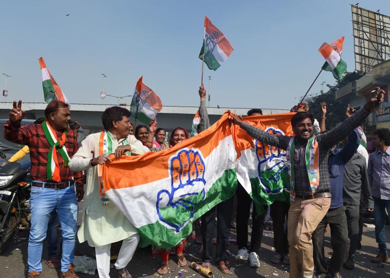 File photo of Indian Congress party supporters holding a Congress party flag as they celebrate in Ahmedabad on Dec 11, 2018.