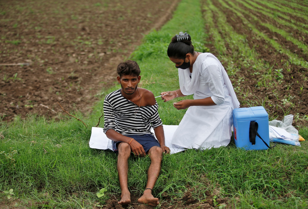 A farmer receiving the Covishield vaccine in a field on his farm, during a door-to-door vaccination drive in Gujarat, India, last month.
