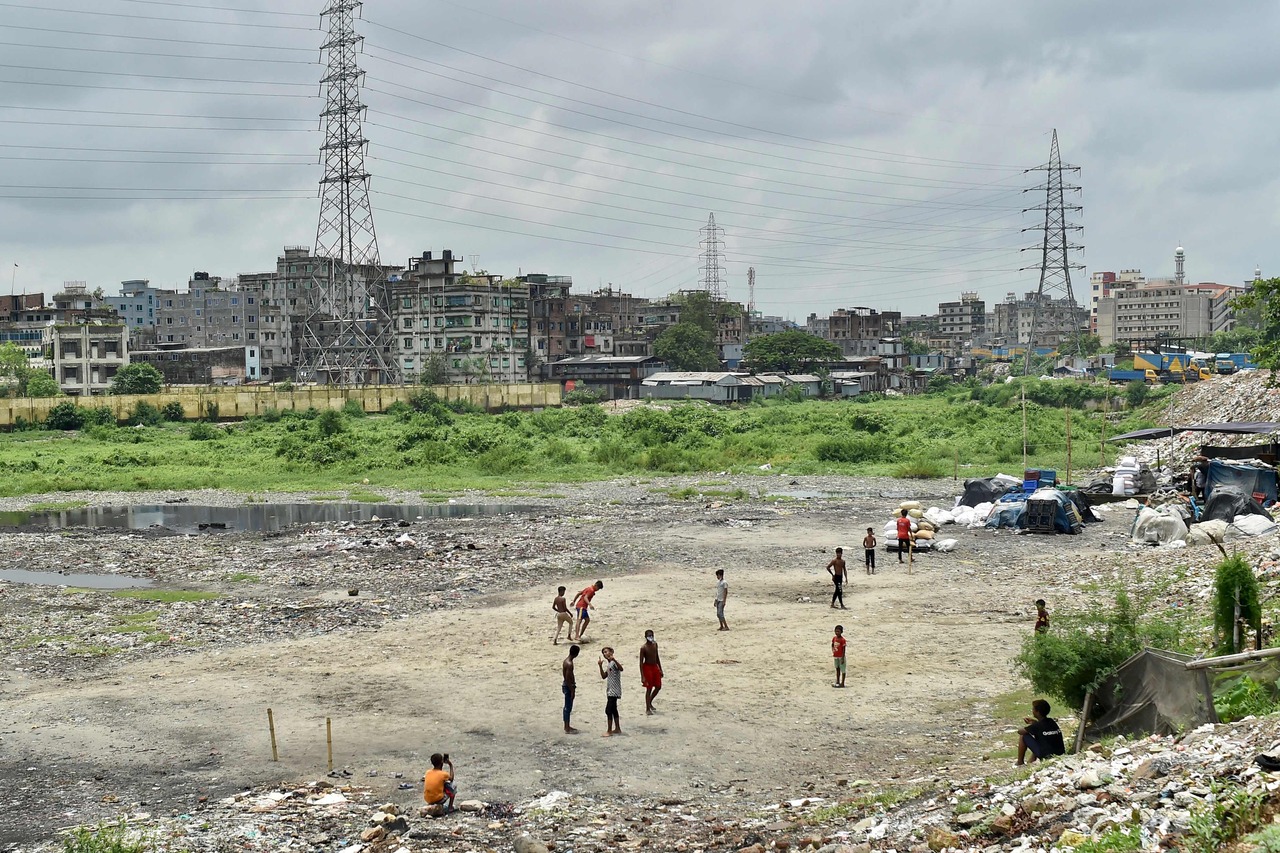 Youths play football during a nationwide Covid-19 lockdown in Dhaka on July 3, 2021.