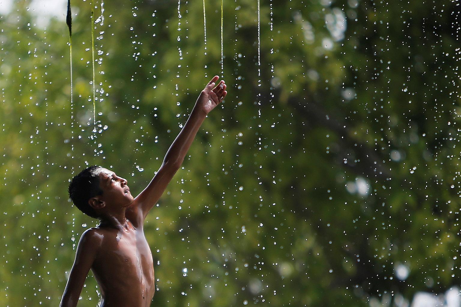 A boy cools off under a water fountain in New Delhi.