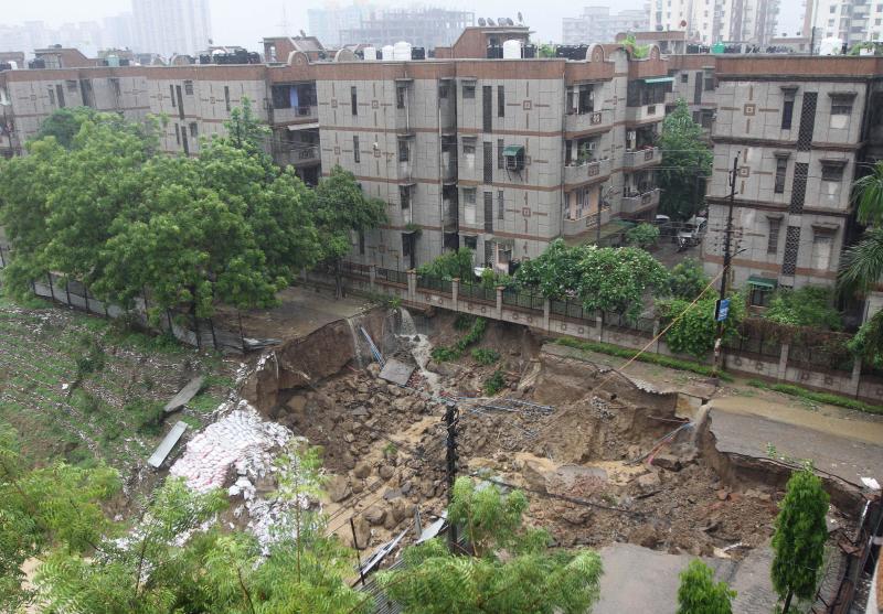 A road that collapsed following heavy rain in Ghaziabad, Uttar Pradesh state, India, on July 26, 2018.