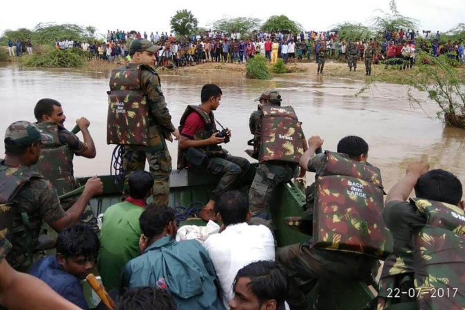 Indian army rescue team officers bringing residents to safety at a flooded area at Kuda village in Surendranagar district on July 22, 2017.