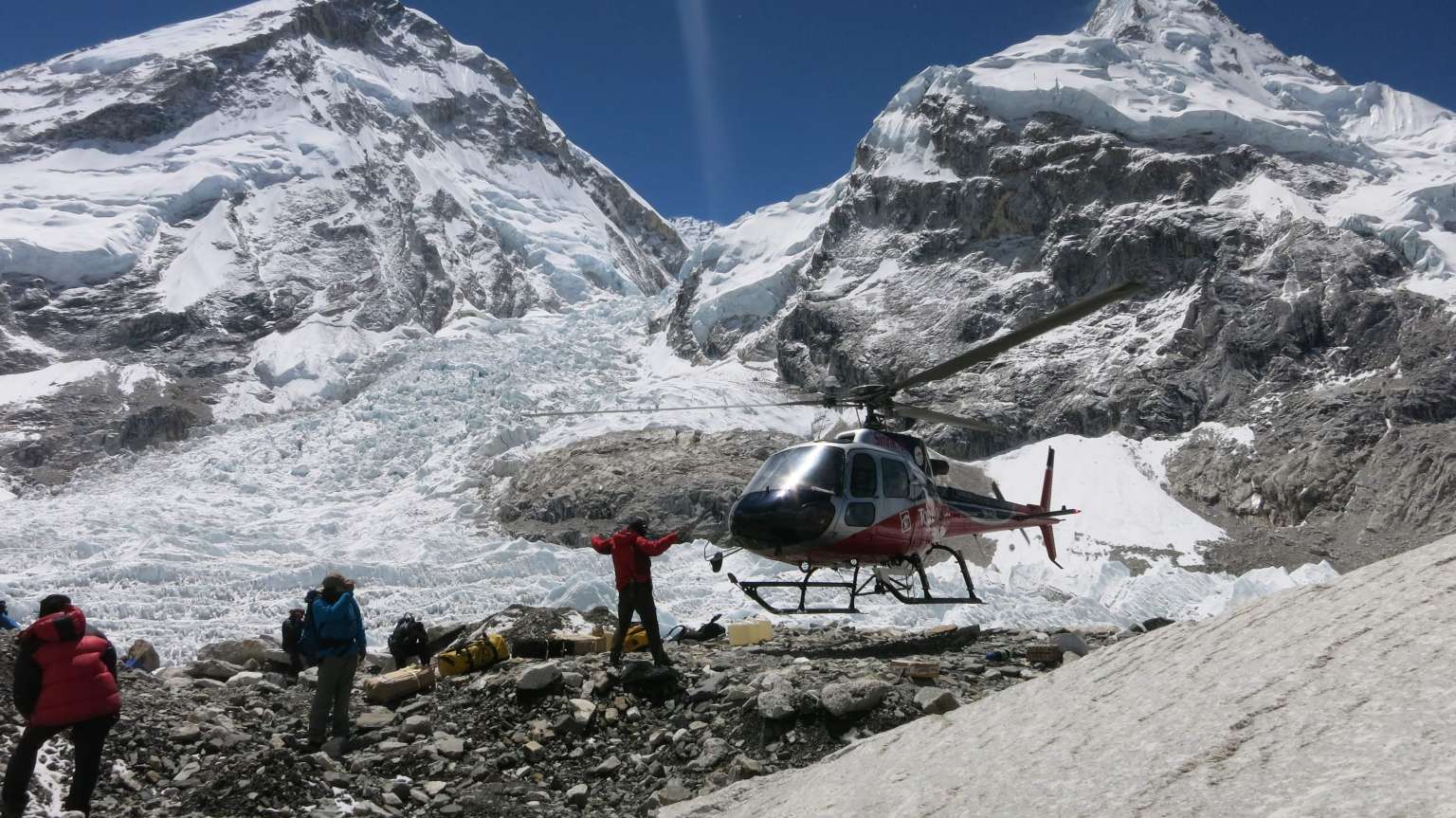 Mountaineers gathering as a helicopter lands at Everest Base Camp, on May 15, 2016.
