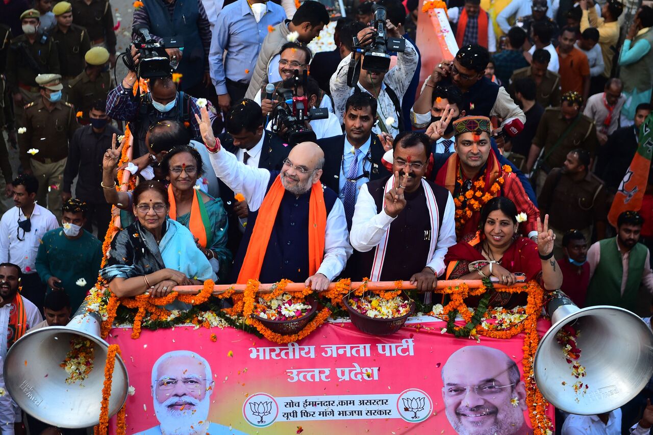 India's Home Minister and BJP leader Amit Shah (centre) during a roadshow ahead of Uttar Pradesh state assembly elections in Allahabad on Feb 22, 2022.