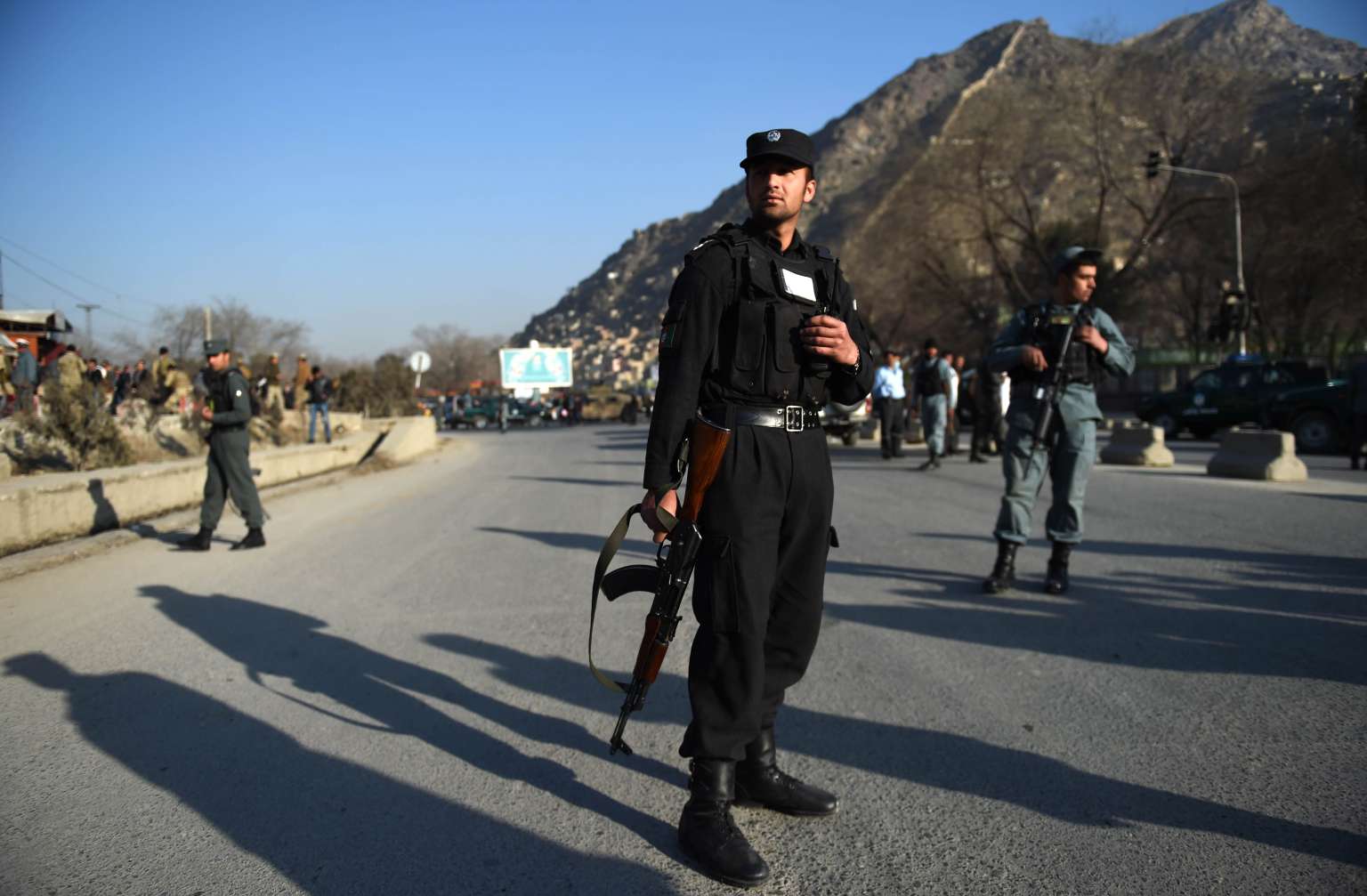 Afghan security personnel standing guard outside a police base in Kabul on Feb 1, 2016.