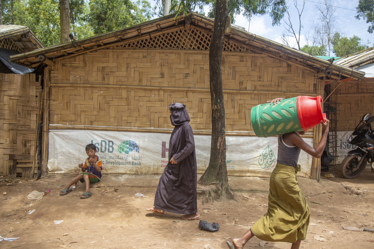 A Rohingya refugee carries a gas cylinder at a makeshift camp in Kutubpalang, Ukhiya, Cox Bazar district, Bangladesh, on Aug 25, 2022.