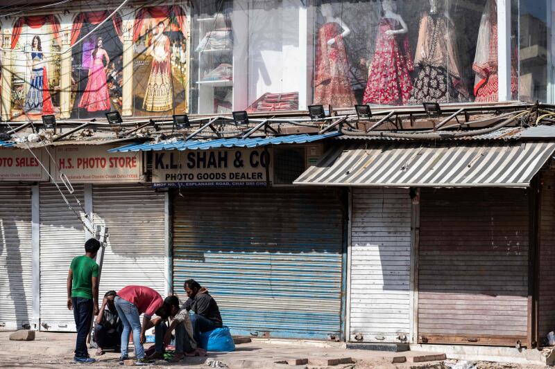 Migrant workers sit in front of closed shops during a nationwide lockdown in New Delhi.