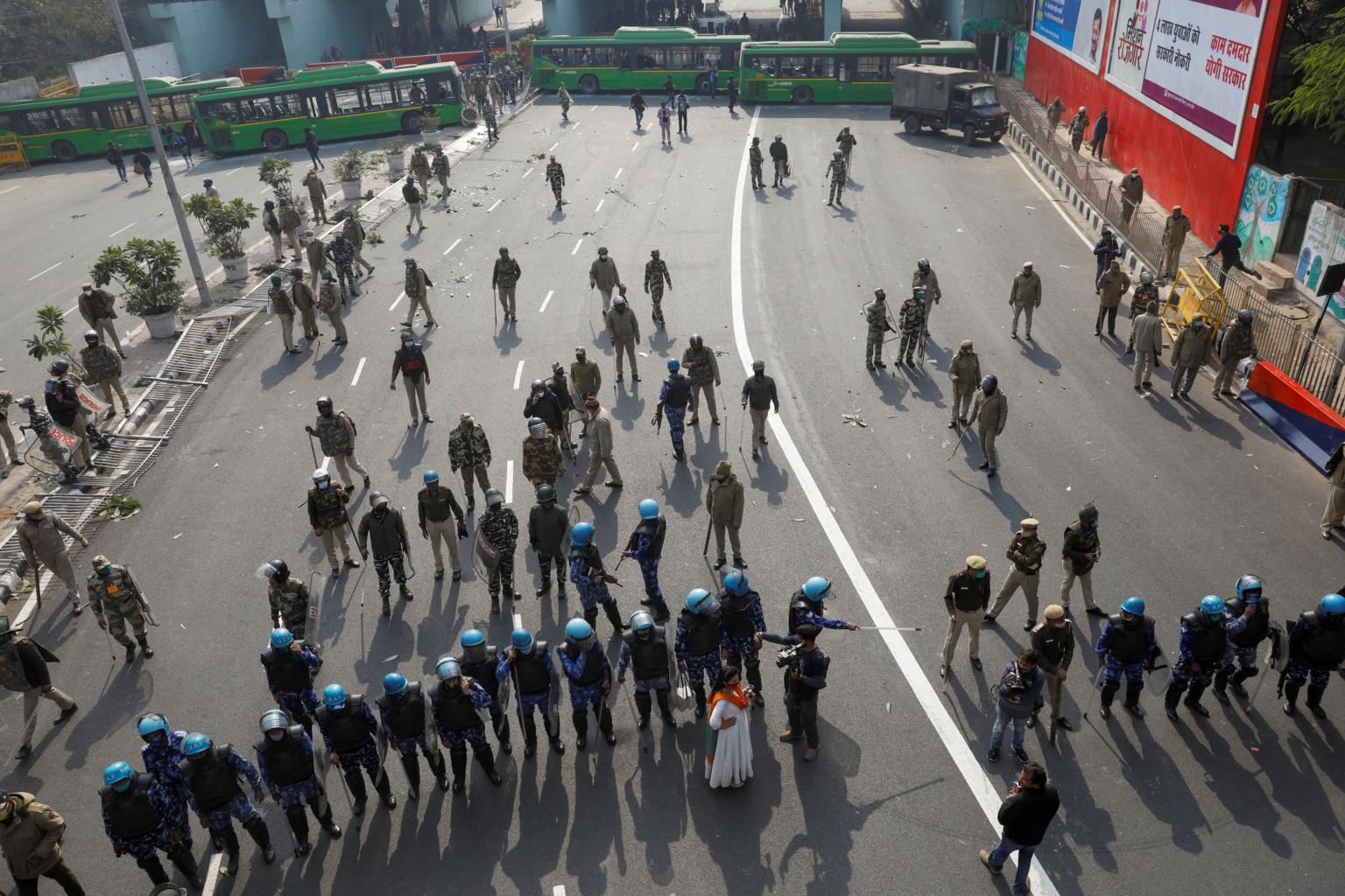 Police officers stand guard during a protest against farm laws introduced by the government, in New Delhi, on Jan 26, 2021.