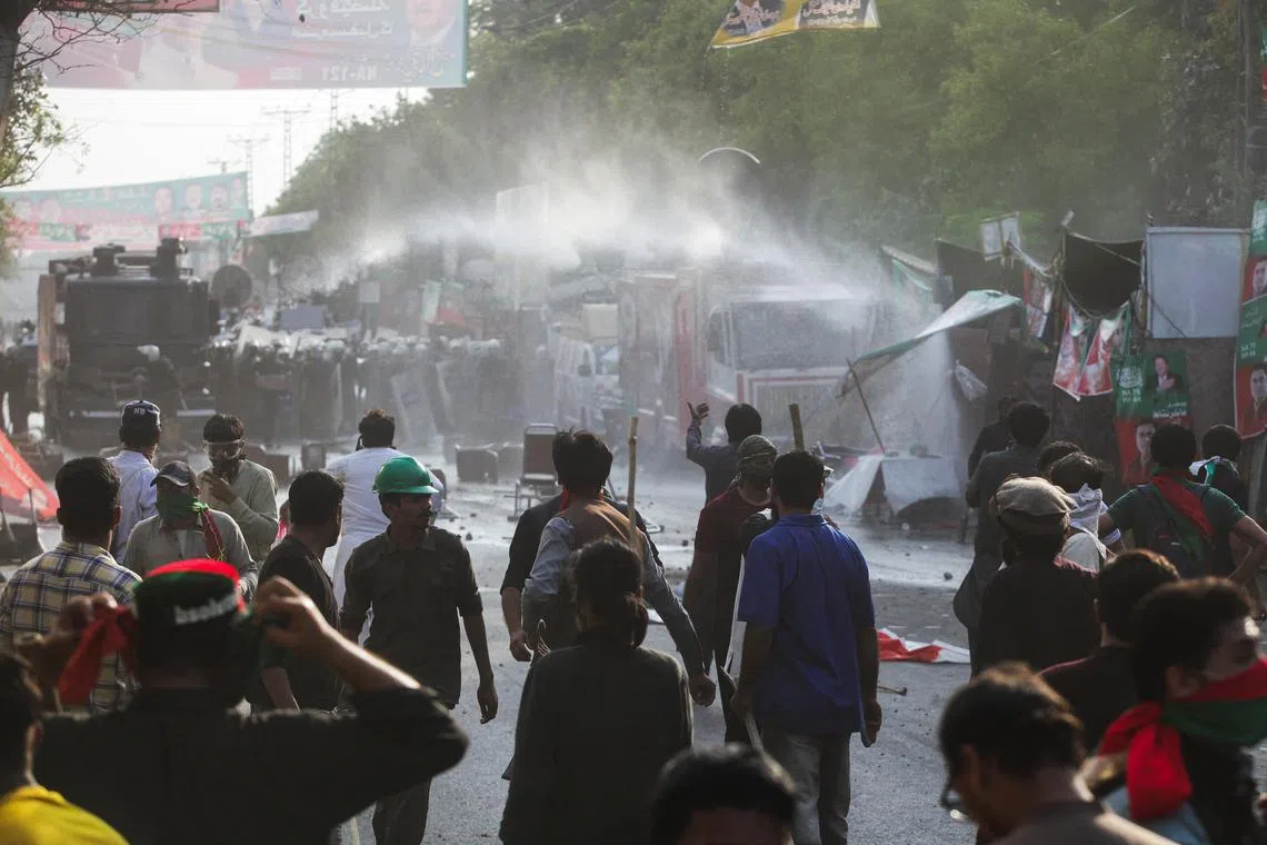 Police fire water cannons at supporters of former prime minister Imran Khan, near his home in Lahore, Pakistan.