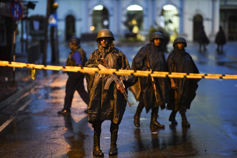 Sri Lankan soldiers stand guard at St Anthony's Shrine in Colombo on April 25, 2019, following a series of bomb blasts targeting churches and luxury hotels across Sri Lanka on Easter Sunday.