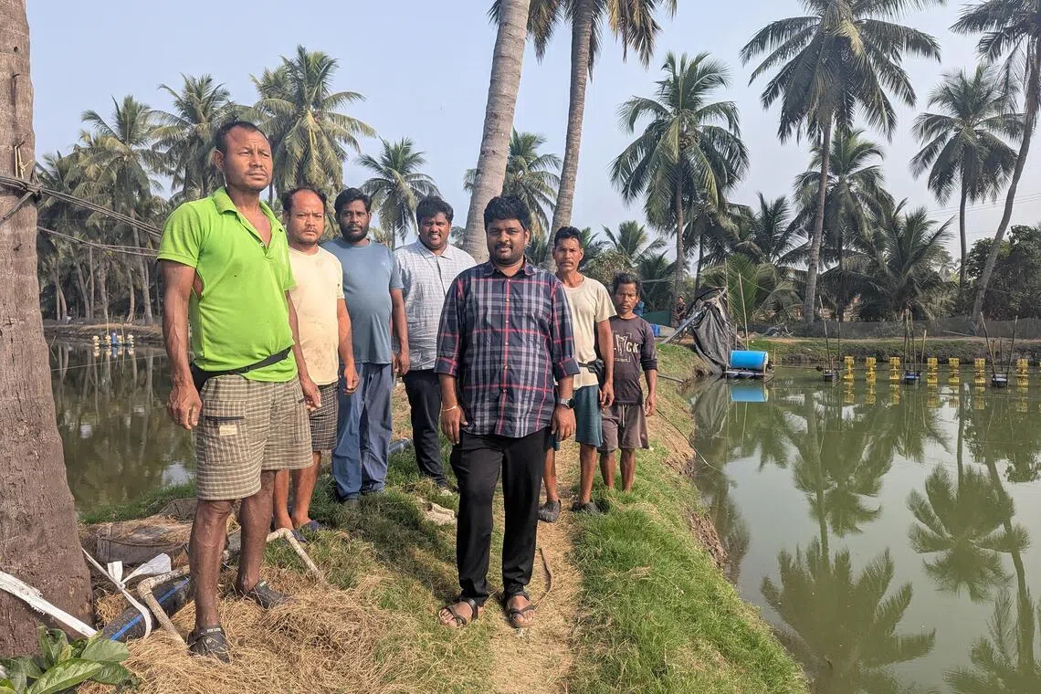 Mr Venkatapathiraju Penmesta (second from left) employs nearly 200 workers on his shrimp farms in Andhra Pradesh, many of them migrants from Assam in north-east India. By March, if he is not able to get good prices, he will have to send them home.
