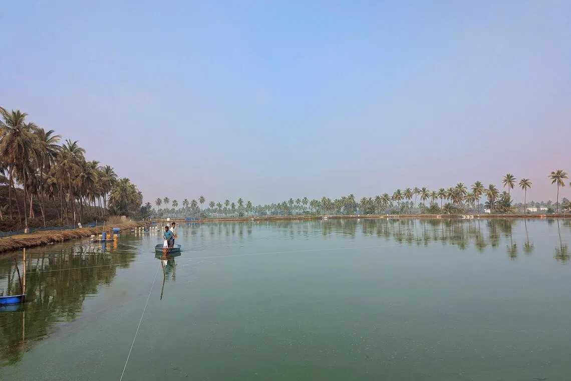 Workers, many of them migrants from other states, throwing feed into a shrimp pond in Bhimavaram, India's shrimp export hub in the Andhra Pradesh state.