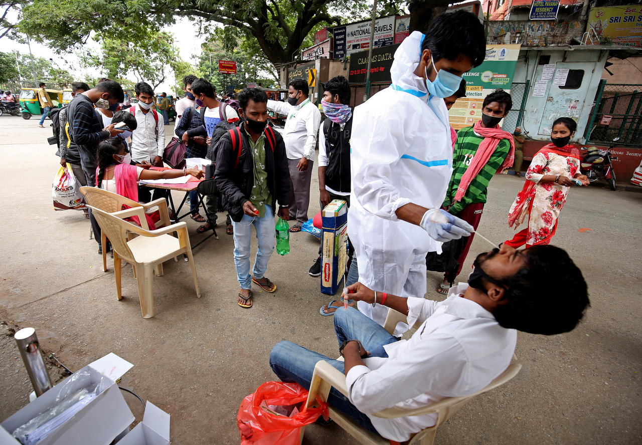 A health worker takes a nasal swab sample of a man at the City Railway station in Bangalore, on Aug 2, 2021.