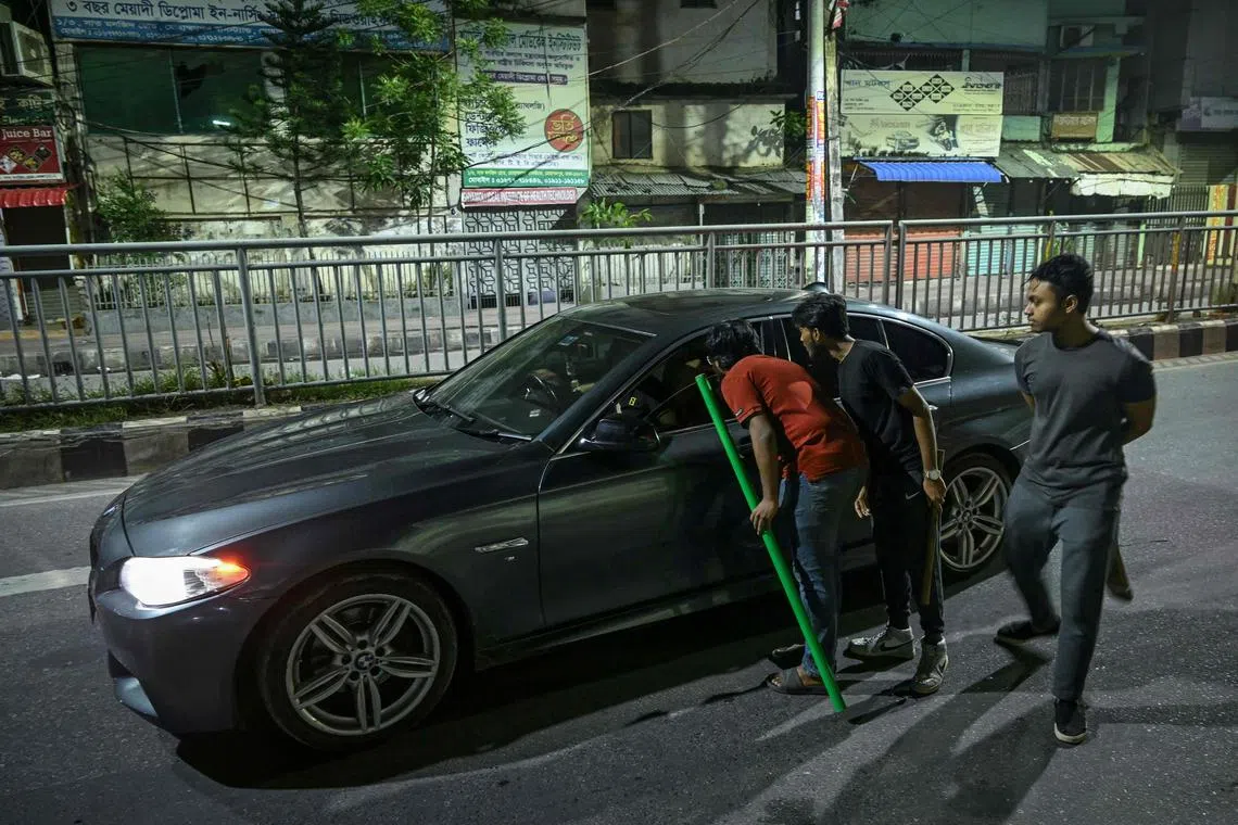 Volunteers inspect a car while patrolling around neighbourhoods, in the absence of police in Dhaka, Bangladesh.