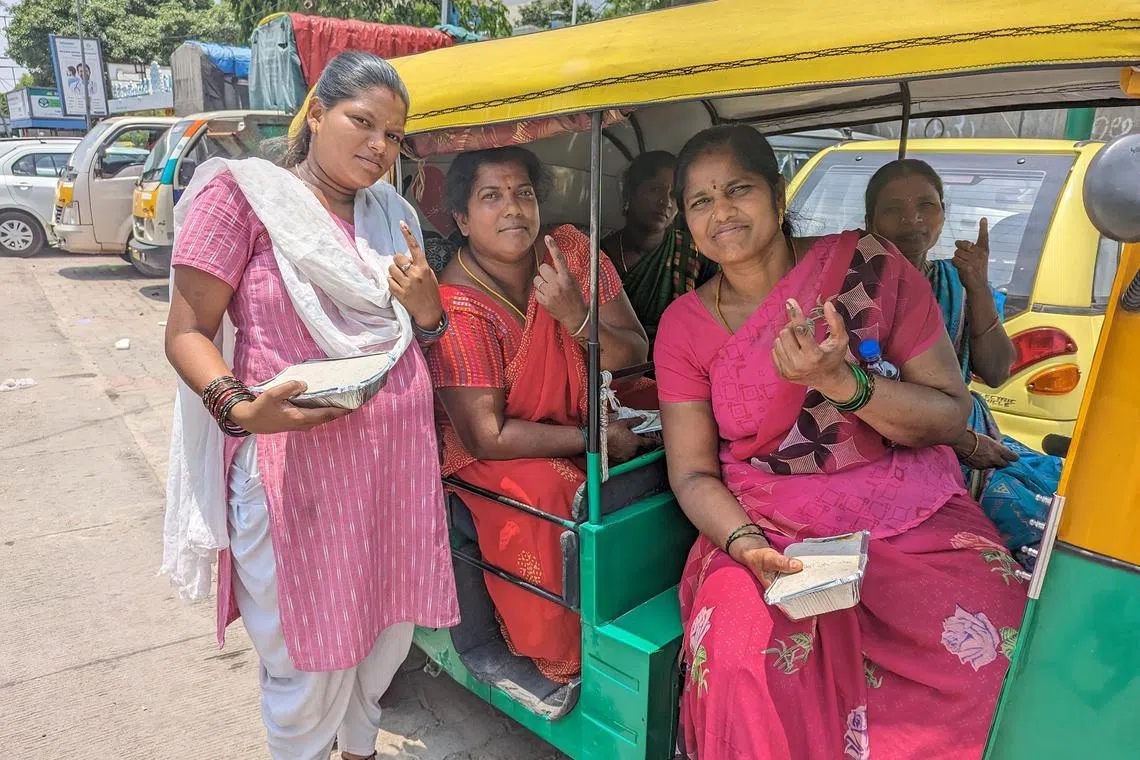 Women in Chickpet constituency in Bengaluru find shade in an autorickshaw to eat lunch after they voted.