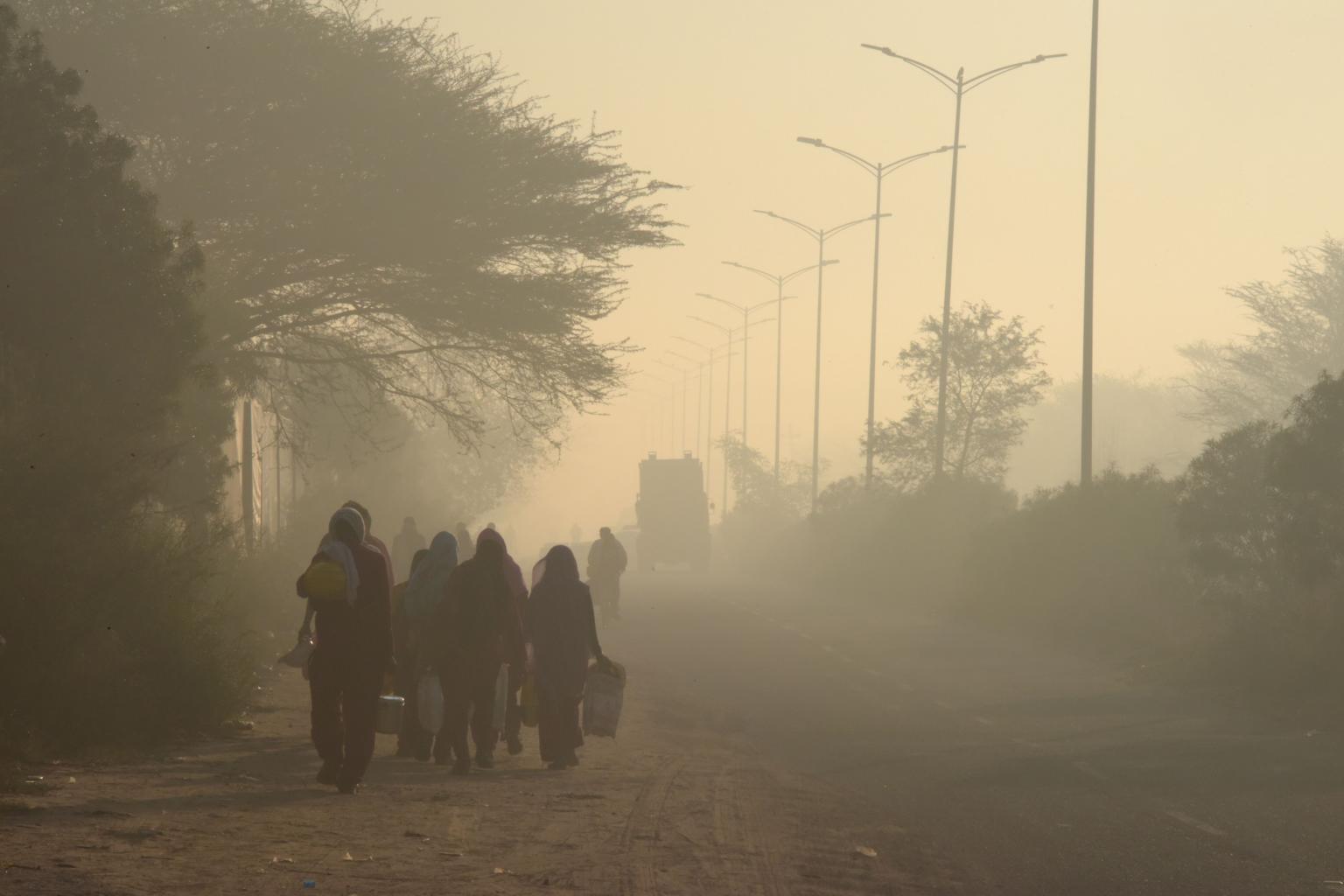 People walk amid heavy smog in Gurgaon, India, on March 7, 2019. The more immediate effects of air pollution, like itchy eyes and coughing, tend to be highlighted by people, rather than the risks from chronic exposure, pointing to the fact that people don't attribute or understand that it has longer-term health impacts.