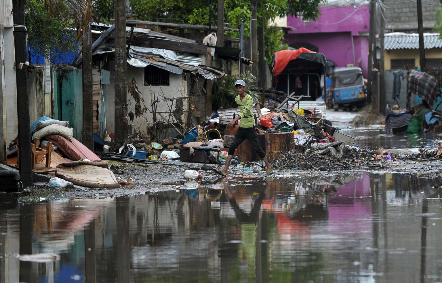 A Sri Lankan resident walks through floodwaters in the Kolonnawa suburb of Colombo on May 24, 2016.