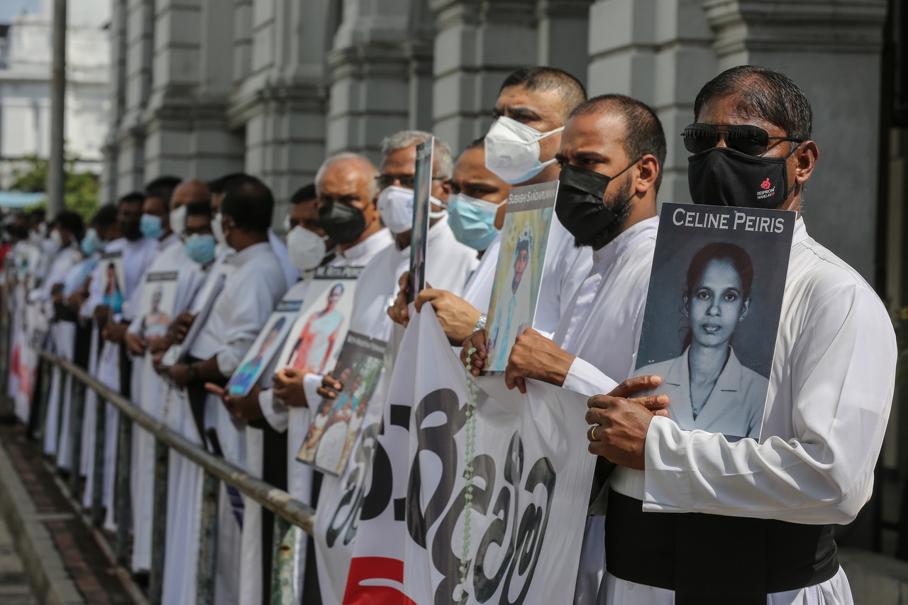Catholic priests holding banners and photographs of victims of the 2019 Easter bombings during a protest in Colombo on Nov 22, 2021.